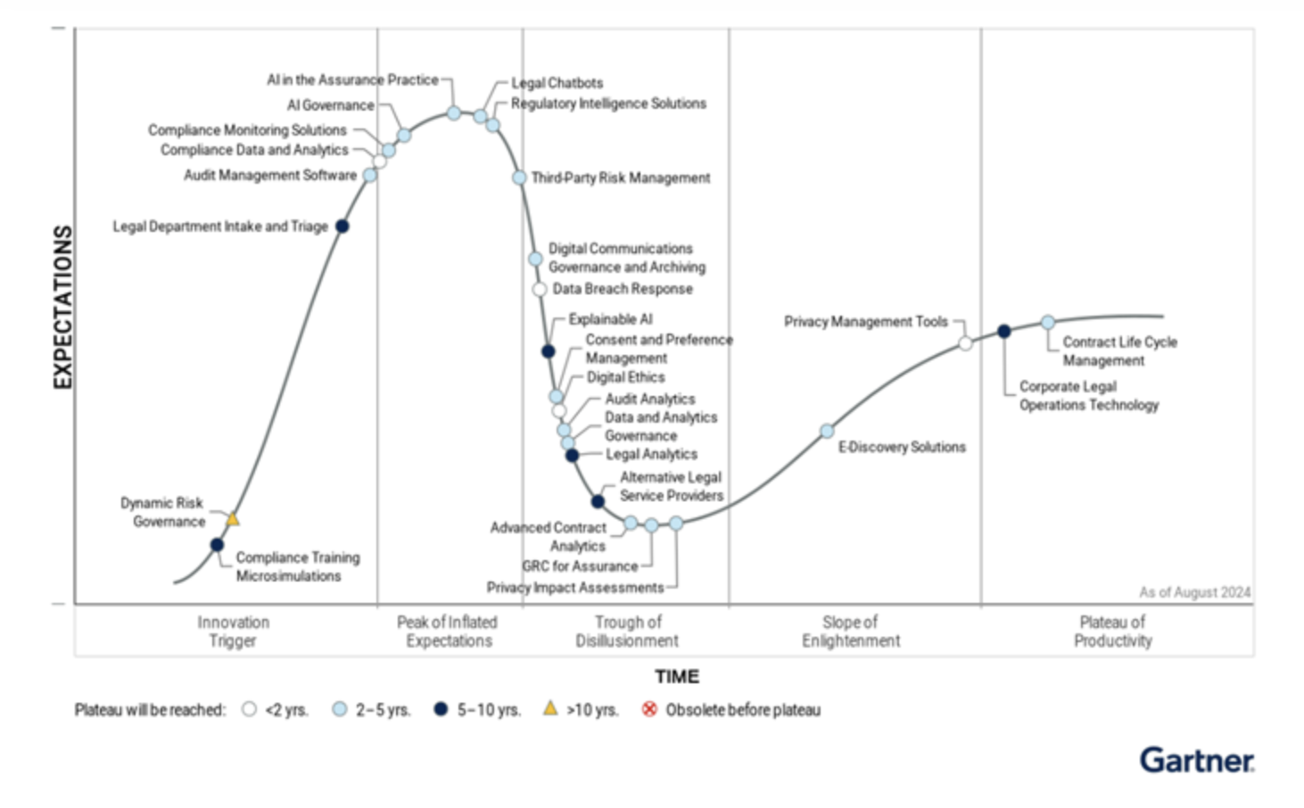 Gartner published an article end of last year on the broader predictions of GRC functions. In this prediction we see a plot of different GRC aspects and functions on their own Hype Cycle. Interestingly, Gartner believes a lot of the initiatives are already on the downward slope into the trough through of disillusionment and predicted to enter the plateau of productivity in the coming few years. In Europe, this is likely being sped up with a number of regulations coming in effect, such as the Digital Services act and NIS2. A common misconception is that a large number of organizations are not affected by these developments due to them not being applicable to them. The reality is that due to, for instance, the supply chain principle, the larger organizations are still demanding compliancy from the smaller players. This makes GRC suddenly a management focus point for every organization.